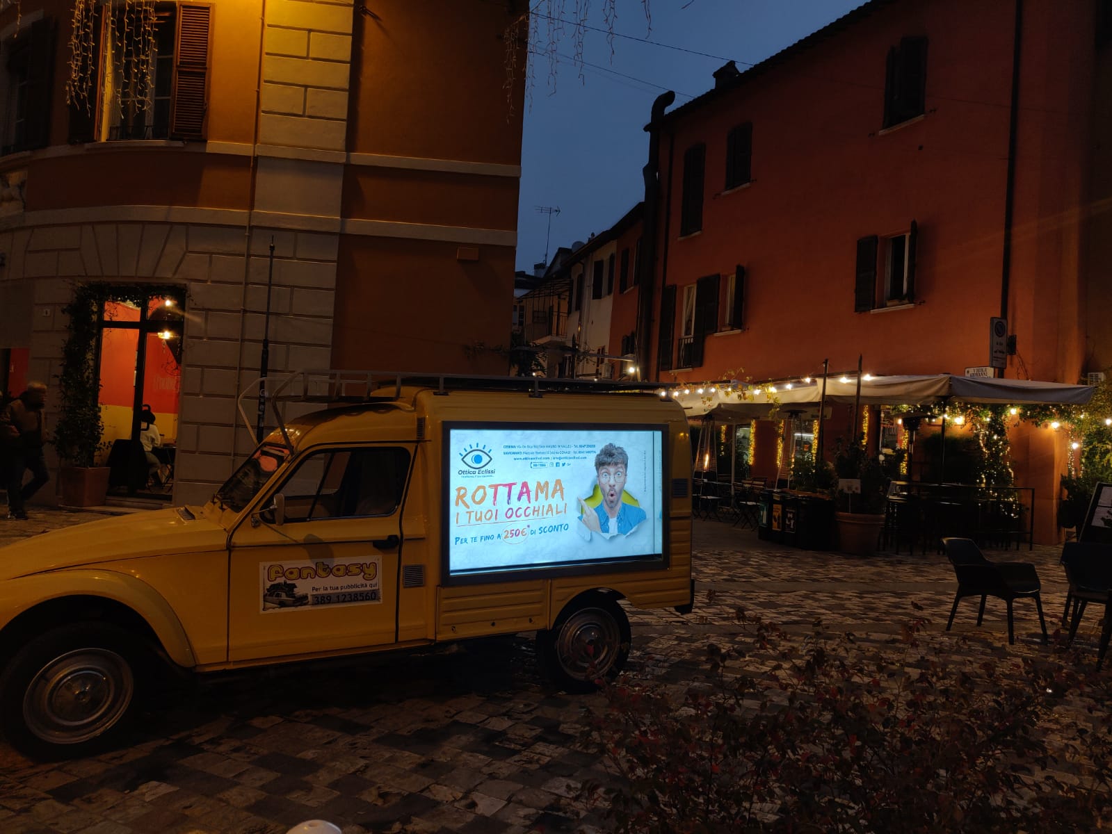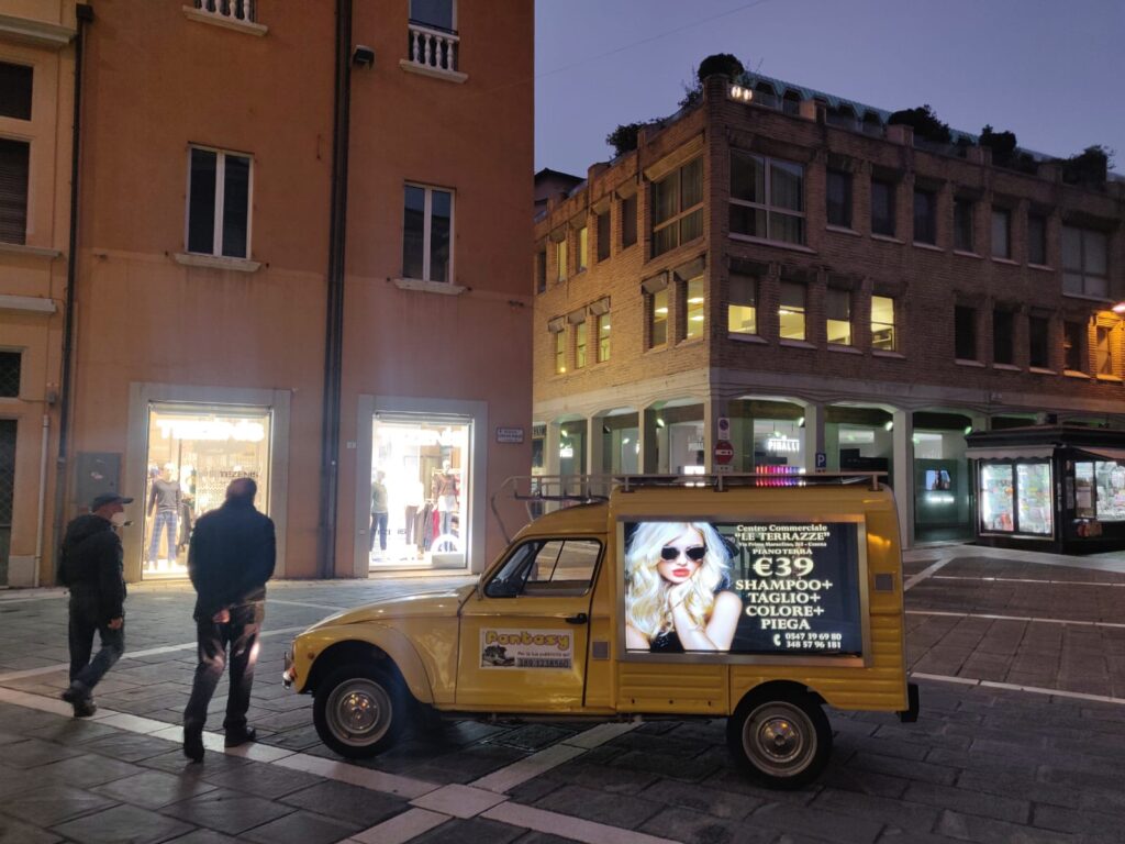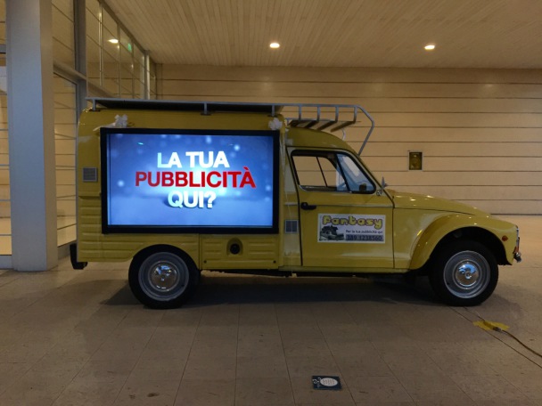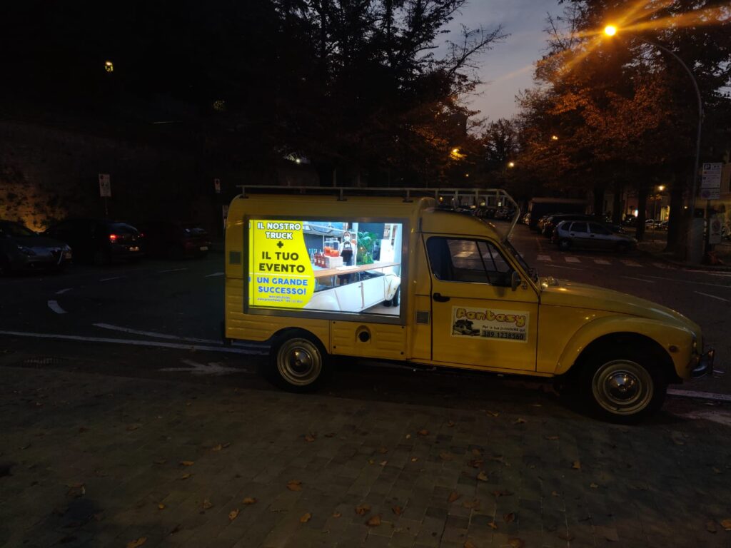 Ecco la sorprendente novità! la mitica Dyane accoglie due maxi schermo Led HD ad alta definizione per una pubblicità ancora più sorprendente e curiosa!